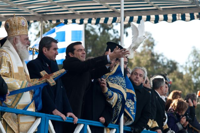 Πειραιάς, 6 Ιανουαρίου 2015. Στην καθιερωμένη τελετή του Αγιασμού των Υδάτων, οι κάμερες (φωτ. Άγγελος Χριστοφιλόπουλος) απαθανατίζουν τον (ακόμη) αρχηγό της αξιωματικής αντιπολίτευσης Αλέξη Τσίπρα να ελευθερώνει, κατά το τελετουργικό της ημέρας, ένα περιστέρι.